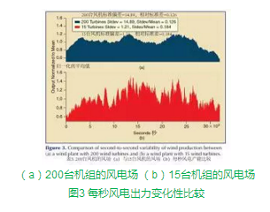 總的來說,隨著并網(wǎng)風(fēng)電機(jī)組增多,風(fēng)電在電網(wǎng)中的變化就會越來越小。圖3是從美國國家可再生能源實驗室風(fēng)電場數(shù)據(jù)收集項目中截取的具有幾個互聯(lián)點的某風(fēng)電場約9小時內(nèi)每一秒的數(shù)據(jù)。這一數(shù)據(jù)來自同一時間段,并將每個機(jī)組群的平均輸出值進(jìn)行了規(guī)范化處理。圖3(a)顯示了200臺機(jī)組數(shù)據(jù)進(jìn)行標(biāo)準(zhǔn)化處理后的變化情況。圖3(b)顯示了15臺機(jī)組數(shù)據(jù)的巨大變化。從這些數(shù)據(jù)及圖示中可以得出結(jié)論,隨著風(fēng)電機(jī)組的集群化,標(biāo)準(zhǔn)化處理過的風(fēng)電變量在下降。這一規(guī)律同時適用于較小區(qū)域內(nèi)和大范圍的風(fēng)電集群,也適用于電網(wǎng)運行的所有時間尺度。