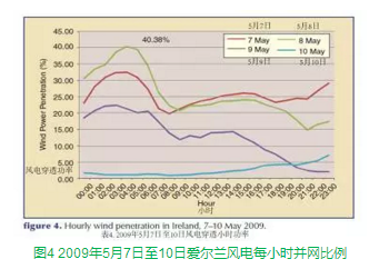 一些國家的電網(wǎng)運營商在積累高比例風(fēng)電并網(wǎng)及其變化規(guī)律的運營經(jīng)驗。圖4顯示了從2009年5月7日至10日,愛爾蘭風(fēng)電的每小時接入比例,范圍從很小的比例到高達(dá)40%。同樣,圖1(如上所述)顯示了2005年1月丹麥的實際負(fù)荷與凈負(fù)荷(減去風(fēng)電后的負(fù)荷)。該圖顯示風(fēng)力發(fā)電量逐漸增加,而后由高風(fēng)速導(dǎo)致停機(jī)使發(fā)電量減少。更高的風(fēng)力發(fā)電量使得凈負(fù)荷在某些時段接近于零。正如本文后面討論的,電網(wǎng)運營商通過使用現(xiàn)有的靈活發(fā)電資源、風(fēng)力預(yù)測以及時間調(diào)度等手段,來應(yīng)對風(fēng)力的變化。在以更接近于實時的情況下進(jìn)行評估時,發(fā)電量更具可預(yù)測性,而小于小時單位的調(diào)度方案也使電網(wǎng)運營方可以充分利用其他發(fā)電設(shè)備的靈活性。此外,更大范圍內(nèi)(或電網(wǎng)覆蓋區(qū)域)的電力平衡有助于解決風(fēng)電的變化,因為在較大的地理區(qū)域內(nèi)風(fēng)電的波動性會趨于平緩。