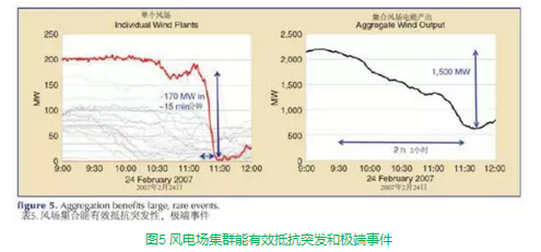 遇極端天氣情況,風(fēng)速增大,出于安全考慮,風(fēng)電機(jī)組需要停機(jī),這時候怎么辦呢?這樣的極端天氣并不常見,在一些地方并不是每年都會出現(xiàn),而有些地區(qū)一年中也只會出現(xiàn)一到兩次。大風(fēng)暴在4到6小時就可行進(jìn)幾百公里,所以,廣闊地理區(qū)域的風(fēng)電集群可以應(yīng)對這一挑戰(zhàn)。在這種情況下,單臺風(fēng)電機(jī)組可能從滿發(fā)突然降到零,而更大地理范圍內(nèi)的集群風(fēng)電機(jī)組就會把這樣的突然中斷轉(zhuǎn)化為數(shù)小時的逐漸下降過程。2007年2月美國德克薩斯州就發(fā)生了這樣的風(fēng)暴。圖5顯示了一個風(fēng)電場的出力在約15分鐘內(nèi)驟降17萬千瓦的過程。而對于所有風(fēng)電場來說,總出力雖然下降了150萬千瓦,但該過程持續(xù)了2個小時。在丹麥西部,最近一次風(fēng)暴(2005年1月)使200萬千瓦額定容量的風(fēng)電出力降低90%,用了6個小時。