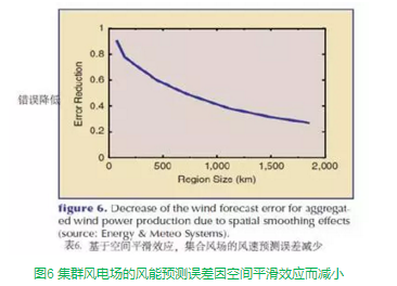如圖所示,750公里以上范圍的風(fēng)電集群預(yù)測誤差降低了50%。圖中顯示了誤差率已經(jīng)降至區(qū)域預(yù)測和單一風(fēng)電場的標(biāo)準(zhǔn)誤差(RMSE)之間,以上數(shù)據(jù)是基于對德國40個風(fēng)電場所發(fā)電量的測量結(jié)果得到的。德國的一些其他研究顯示,對于一個獨立風(fēng)電場的典型風(fēng)能預(yù)測誤差約為該風(fēng)電場裝機(jī)容量的10%~15%標(biāo)準(zhǔn)誤差(RMSE),而對未來一天某一區(qū)域的誤差率降至6%~8%,對于整個德國的風(fēng)能預(yù)測誤差降至5%~7%。如標(biāo)準(zhǔn)誤差(RMSE)法所測算的那樣,綜合應(yīng)用不同的風(fēng)能預(yù)測模型,也能提高最多20%的風(fēng)能預(yù)測精度。