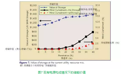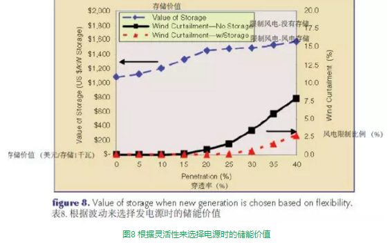 圖7是近似于美國西部電網(wǎng)調(diào)度的一個簡單例子,圖中所有數(shù)值僅供參考,假定一個為高峰負(fù)荷的10%、具有168小時的儲能能力的儲能設(shè)備,然后進(jìn)行儲能分析。系統(tǒng)大量接納風(fēng)電的能力主要取決于其他多種電源的構(gòu)成情況。儲能是一種靈活的電源形式,即使系統(tǒng)中沒有風(fēng)電,儲能本身對電網(wǎng)系統(tǒng)來說也是具有經(jīng)濟(jì)價值的。隨著風(fēng)電并網(wǎng)量的增加,儲能系統(tǒng)的價值也相應(yīng)提升。沒有風(fēng)電的情況下,儲能的價值在每千瓦超過1000美元,可見,低成本的儲能設(shè)備為系統(tǒng)提供了可觀的經(jīng)濟(jì)價值。隨著風(fēng)電接入比例的提高,儲電系統(tǒng)的價值也會增加,最終能達(dá)到每千瓦1600美元左右。目前美國很多地區(qū)的電源結(jié)構(gòu)與這個例子中的情況很接近。在風(fēng)電占比很高的系統(tǒng)中,儲能具有更大價值,因為調(diào)度起來更經(jīng)濟(jì),從而使可變成本較低的發(fā)電機(jī)組(諸如火電和核電)的利潤空間受到壓縮(及產(chǎn)生市場出清價格)。更多的低電價時段拉大了價差,增加了套利的機(jī)會,提升了儲能的價值。
