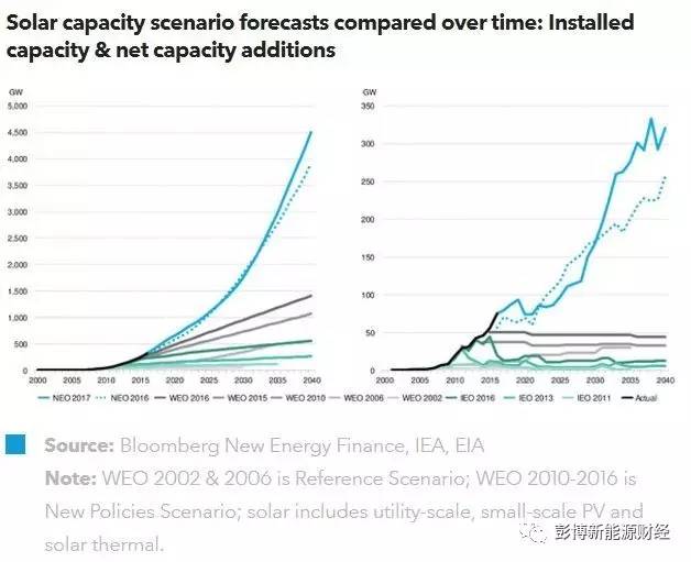 2017年彭博新能源財經(jīng)新能源市場長期展望預(yù)測,光伏和光熱的總裝機將達(dá)4,506GW,而IEA報告則僅在“新政策情景”下,給出了1481GW的預(yù)測值。