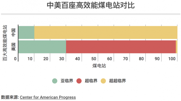 超超臨界燃煤發(fā)電技術也有望幫助相關電廠達到這個相對嚴格的環(huán)保要求。相比于亞臨界燃煤機組,超超臨界火力發(fā)電機組的燃煤溫度更高(約760攝氏度),內(nèi)部壓力也更大(超過3萬多千帕),因此發(fā)電效率也更高。美國進步中心(Center for American Progress,后文簡稱CAP)最新發(fā)布的一份報告顯示,中國能效最高的100家燃煤電廠中超過90%配備了超超臨界技術設備,而美國的這一數(shù)字僅為0.76%。顯然,中國在這一方面步子邁得比美國更大。