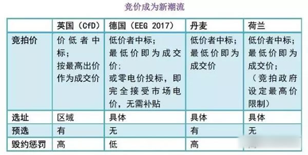目前,采用競(jìng)拍的方式?jīng)Q定上網(wǎng)電價(jià)正在成為趨勢(shì),英國(guó)、德國(guó)、荷蘭都開始改成這種形式,與中國(guó)最初推行海上風(fēng)電時(shí)實(shí)施的特許經(jīng)營(yíng)權(quán)有些類似。這種模式下產(chǎn)生的價(jià)格由競(jìng)爭(zhēng)產(chǎn)生,更利于海上風(fēng)電價(jià)格下降,但對(duì)于企業(yè)而言風(fēng)險(xiǎn)較大,更適宜較為成熟的市場(chǎng),無論是供應(yīng)鏈還是玩家的風(fēng)險(xiǎn)掌控能力都更強(qiáng)。