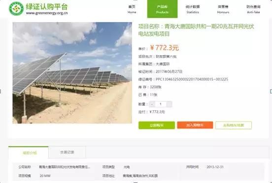 目前首個也是唯一一個掛牌出售綠證的光伏項目為“青海大唐國際共和一期20兆瓦并網(wǎng)光伏電站發(fā)電項目”,位于青海共和縣境內(nèi),掛牌單價772.3元,此次掛牌數(shù)量為3223個,目前已售11個。