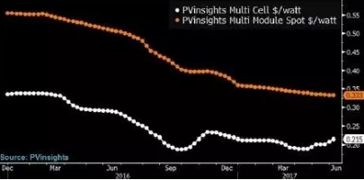 太陽能電池板的價(jià)格目前就呈現(xiàn)下降趨勢,繼2016年下跌35%之后,2017年又下跌8%,在供應(yīng)過剩形勢惡化的影響下,下半年價(jià)格還會加速下跌。太陽能報(bào)價(jià)機(jī)構(gòu)PVinsights稱,今年多晶硅太陽能電池板平均市場價(jià)格為每瓦0.35美元。降價(jià)趨勢迫使設(shè)備供應(yīng)商為保住利潤而大力削減成本。由此可以預(yù)料,今年下半年競爭將更為激烈。