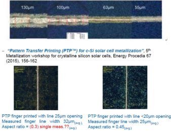 PTP 技術(shù)的最大優(yōu)勢在于它對金屬材料利用率高,并且與絲網(wǎng)印刷相比擁有更高的精度,可以打印更細(xì)的柵線(最細(xì)可達(dá)10μm)。因此,即便是使用標(biāo)準(zhǔn)工業(yè)漿料,PTP 技術(shù)也可以有效提升光伏電池轉(zhuǎn)換效率,保持電池的耐久性和可存儲性。