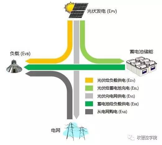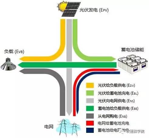 中國(guó)儲(chǔ)能網(wǎng)訊:光伏儲(chǔ)能系統(tǒng)能量管理的目標(biāo)是:能量資源與負(fù)荷需求的精確匹配。由于集合了不同的技術(shù),重要的是采取正確的策略實(shí)現(xiàn)性能的最大化以及成本最小化。下圖是光伏儲(chǔ)能系統(tǒng)能量流動(dòng)的關(guān)系圖。