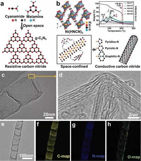 b)導(dǎo)電碳化氮制備的相似CVD路線:Ni(HNCN)2的晶體結(jié)構(gòu),重量分析法與質(zhì)譜法聯(lián)用測(cè)定Ni(HNCN)2在Ar2氣流下以10 o C/min 升溫的表征,這種前驅(qū)體同時(shí)作為氮源和碳源,在Ni催化反應(yīng)過程中以揮發(fā)的N原子團(tuán)作為摻氮的原料獲得高導(dǎo)電性的富有非石墨化氮的碳材料。