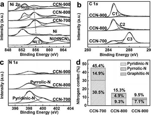 a)以Ni(HNCN)2為前驅(qū)體,與金屬Ni對(duì)比的CCN-700,CCN-800,CCN-900樣品Ni 2p的高分辨XPS譜圖。