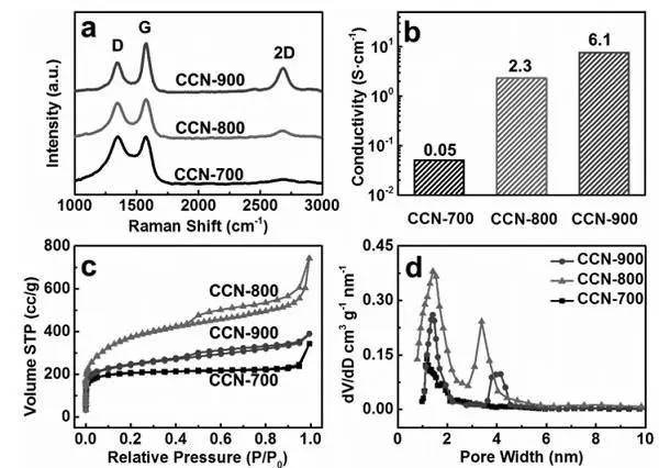 a)拉曼光譜,b)電導(dǎo)率,c)N2吸脫附以及d)CCN-700,CCN-800,CCN-900三種材料的孔徑分布。