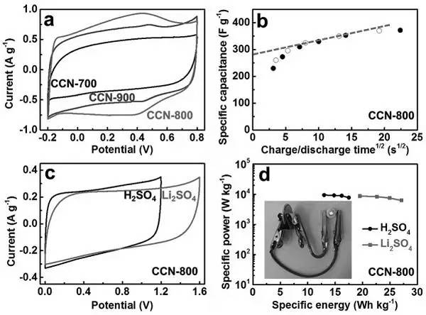 b)CCN-800材料容量相對(duì)于半圈循環(huán)時(shí)間平方根的數(shù)據(jù)圖。實(shí)心符號(hào)代表CV的測(cè)試范圍為2到100 mVs-1,空心符號(hào)代表CC測(cè)試范圍為1到20 Ag-1。對(duì)稱電池的電化學(xué)特征為:CCN-800的陰極和陽(yáng)極在兩種不同的水溶液中:1M H2SO4和2M Li2SO4。