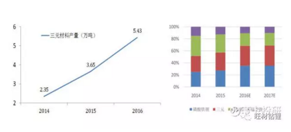 三元電池的正極材料是鎳鈷錳酸鉀三元材料,統(tǒng)計(jì)數(shù)據(jù)顯示,2016年中國(guó)鋰電三元材料產(chǎn)量5.43萬(wàn)噸,同比增長(zhǎng)48.8%;產(chǎn)值79.8億元,同比增長(zhǎng)超過(guò)60%,其技術(shù)構(gòu)成占比在四種正極材料(磷酸鐵鋰、三元材料、鈷酸鋰、錳酸鋰)中最高。