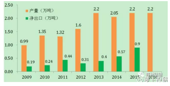 國(guó)內(nèi)氫氧化鋰產(chǎn)量增長(zhǎng)在2013年后趨于穩(wěn)定,但出口量上升明顯。