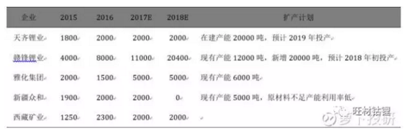 上市公司主要有天齊鋰業(yè)、贛鋒鋰業(yè)、雅化集團(tuán)、新疆眾和、西藏礦業(yè),對(duì)應(yīng)的氫氧化鋰供給數(shù)據(jù)及擴(kuò)產(chǎn)計(jì)劃如下: