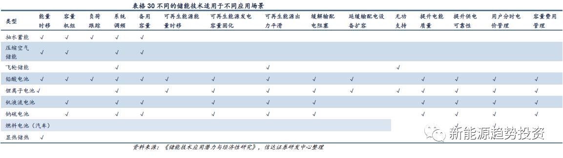 我們將各種儲(chǔ)能技術(shù)根據(jù)其不同的特性與應(yīng)用場景的需求進(jìn)行配對(duì),得到不同儲(chǔ)能技術(shù)最適用的應(yīng)用場景,隨著技術(shù)的進(jìn)步,儲(chǔ)能技術(shù)能適用的場景也會(huì)發(fā)生改變。如飛輪儲(chǔ)能分為能量型和功率型,能量型飛輪儲(chǔ)能目前放電時(shí)間還較短,實(shí)際應(yīng)用價(jià)值不高,但是如果放電時(shí)間可以提升到時(shí)分級(jí),則能量型飛輪儲(chǔ)能也能在可再生能源出力平滑等應(yīng)用場景中有一席之地。