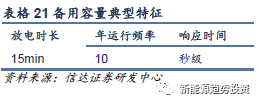 備用容量是指在滿足預(yù)計(jì)負(fù)荷需求以外,針對(duì)突發(fā)情況時(shí)為保障電能質(zhì)量和系統(tǒng)安全穩(wěn)定運(yùn)行而預(yù)留的有功功率儲(chǔ)備,一般備用容量需要在系統(tǒng)正常電力供應(yīng)容量的15~20%,且最小值應(yīng)等于系統(tǒng)中單機(jī)裝機(jī)容量最大的機(jī)組容量。在我國,備用容量服務(wù)分為旋轉(zhuǎn)備用、非旋轉(zhuǎn)備用和其他備用。備用容量一般應(yīng)用在發(fā)電機(jī)組在下線到上線的這段時(shí)間內(nèi),放電時(shí)間相對(duì)較短,但是要求有較大的功率來將儲(chǔ)存的能量在短時(shí)間內(nèi)釋放出去,因此是功率型應(yīng)用。