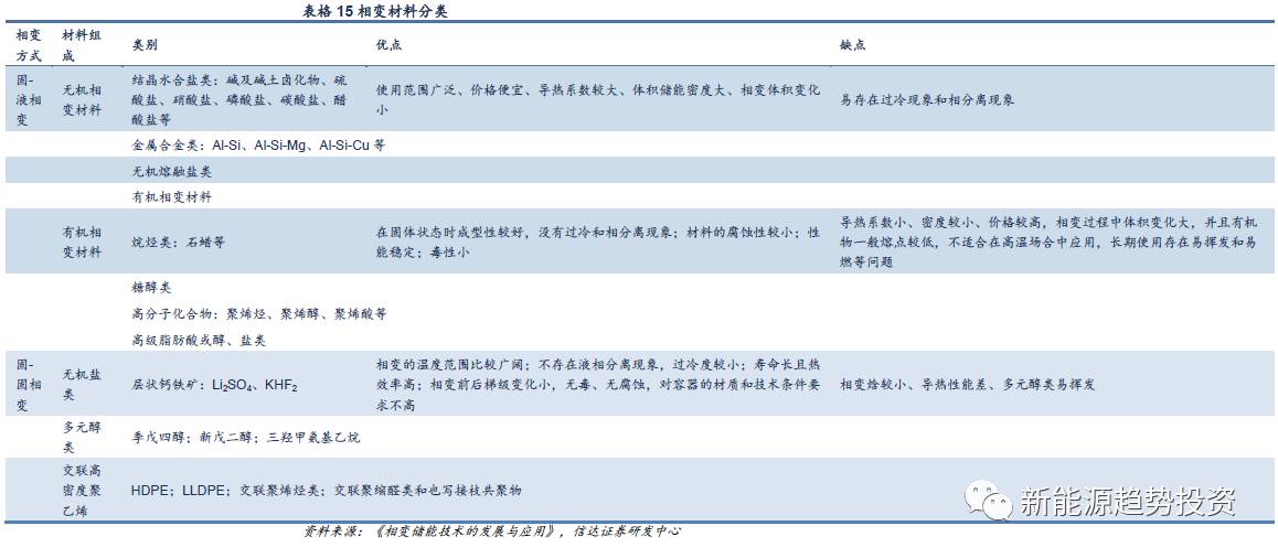 相變儲(chǔ)熱是利用箱變材料在物態(tài)變化時(shí),吸收或放出大量潛熱而進(jìn)行儲(chǔ)能。根據(jù)相變形式不同可以分為固-固相變、固-液相變和氣液相變,而依據(jù)相變材料不同可以分為有機(jī)相變材料和無機(jī)相變材料,每種類型下還可細(xì)分不同類型。理想的相變材料應(yīng)該具有以下性質(zhì):高焓值、導(dǎo)熱系數(shù)高、有合適的相變點(diǎn)、高比熱容、體積膨脹率小、無相分離和過冷現(xiàn)象、循環(huán)穩(wěn)定性高、腐蝕性小、不然、無毒、低成本,目前還沒有相變材料可以同時(shí)滿足上述所有條件。