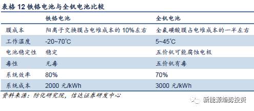 與全釩電池相比,鐵鉻電池有其獨(dú)到的優(yōu)勢,其中陽離子交換膜成本低是其最突出的特點(diǎn),相比全釩電池的膜成本占電堆成本的約1/2,鐵鉻電池的膜成本只占電堆成本的10%。同時(shí)工作溫度廣,電池更穩(wěn)定。目前已有公司可以將鐵鉻電池系統(tǒng)成本降到2000元/kWh以下,有一定成本優(yōu)勢,但是由于尚未規(guī)?;瘧?yīng)用,技術(shù)有效性尚需進(jìn)行實(shí)際驗(yàn)證。
