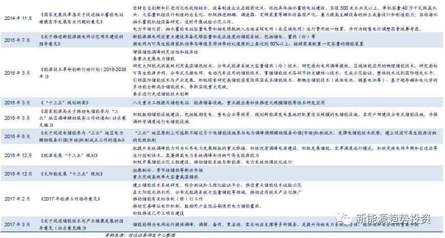 從國內(nèi)的政策看,自2009年《中華人民共和國可再生能源法修正案》中首次提及“儲(chǔ)能”以來,國家已出臺(tái)多個(gè)文件對(duì)儲(chǔ)能行業(yè)進(jìn)行頂層規(guī)劃,然而從整體上看,單獨(dú)對(duì)儲(chǔ)能行業(yè)進(jìn)行指導(dǎo)的政策性文件數(shù)量仍然不多,除去2014年針對(duì)抽水蓄能出臺(tái)了支持政策和補(bǔ)貼標(biāo)準(zhǔn)以外,直到2016年出于解決“三北”地區(qū)可再生能源消納問題能源局出臺(tái)了兩個(gè)通知,其主要針對(duì)的是電化學(xué)儲(chǔ)能技術(shù),對(duì)于儲(chǔ)能技術(shù)范圍及應(yīng)用場景限制頗多。因此在2017年3月的《關(guān)于促進(jìn)儲(chǔ)能技術(shù)與產(chǎn)業(yè)健康發(fā)展的指導(dǎo)意見》(征求意見稿)中,國家對(duì)儲(chǔ)能技術(shù)和應(yīng)用場景不再做過多的限制。