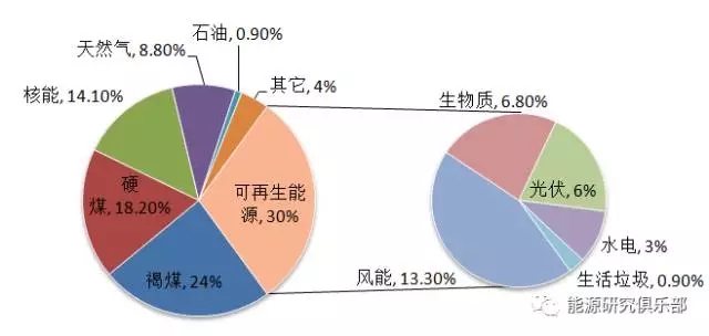 德國(guó)煤炭資源豐富,長(zhǎng)期依賴煤電,自90年代起,德國(guó)就推行其能源轉(zhuǎn)型政策,2015年,可再生能源發(fā)電量占總發(fā)電比例達(dá)到了30%。2015年全年德國(guó)發(fā)電總量6518億千瓦時(shí),其中,可再生能源發(fā)電(主要包括風(fēng)電、水電、生物質(zhì)能發(fā)電、光伏發(fā)電、生活垃圾發(fā)電)1959億千瓦時(shí),占發(fā)電總量的301%;褐煤和硬煤分別發(fā)電1550億千瓦時(shí)和1180億千瓦時(shí),占發(fā)電總量的419%;核電918億千瓦時(shí),占發(fā)電總量的141%;天然氣和燃油發(fā)電分別占發(fā)電總量的91%和8%;其他能源發(fā)電量占發(fā)電總量的41%。