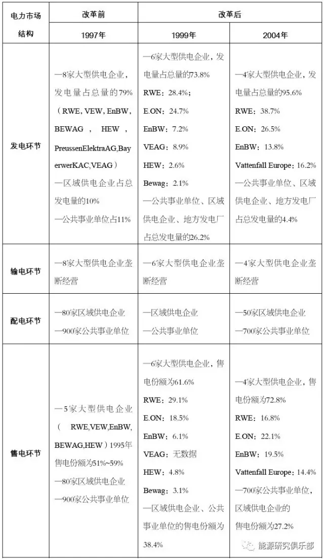 改革前的德國(guó)電力市場(chǎng),擁有一個(gè)高度壟斷的電力市場(chǎng)。意昂、巴登-符騰堡州能源公司、萊茵能源公司、大瀑布公司擁有了德國(guó)超過(guò)80%的電力裝機(jī),并且業(yè)務(wù)幾乎涉及電力的全產(chǎn)業(yè)鏈。
