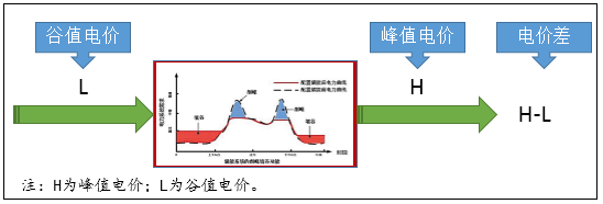 工作模式:儲能系統(tǒng)在谷值電價時段充電,然后在峰值電價時段放出,以此方式賺取電價差額,從而減少用戶電費開支。假定峰值電價H,谷值電價L,則每度電可獲取的最大收益為H-L,詳見下圖;