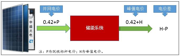 工作模式:分布式光伏系統(tǒng)在白天負(fù)荷高于用戶負(fù)荷時,通常多余的負(fù)荷會反饋給電網(wǎng),以獲取并網(wǎng)電價,價格為光伏補貼電價0.42加上脫硫煤電價P,不同地區(qū)的脫硫煤電價各不相同;儲能系統(tǒng)的作用就是把多余的光伏電量存儲起來,在峰值電價時段放出使用?;诖?,每度電的最大收益為H-P,如下圖。