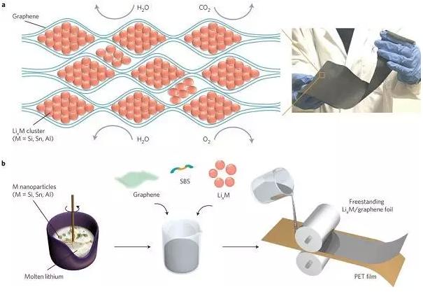 a)左圖:LixM/石墨烯材料結(jié)構(gòu)(注:M= Si、Sn或Al,圖中緊湊的LixM納米顆粒包覆于石墨烯片層中,該材料具有良好的化學(xué)穩(wěn)定性(優(yōu)良的疏水性、較低的氣體滲透性);右圖:材料的柔韌性及可批量生產(chǎn)性;