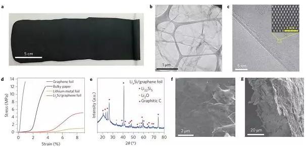 d)石墨烯、松厚紙、鋰箔和LixSi/石墨烯四種材料的單軸拉伸測試曲線(旨在獲得材料的機(jī)械強(qiáng)度和柔韌性);