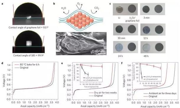 f) LixSi/石墨烯負(fù)極片耐空氣中H2O性能的考察(圖中黑色、紅色曲線分別為未暴露于空氣、暴露于空氣中(相對濕度20~60%,時(shí)間3天)后電池材料的電壓-容量曲線);