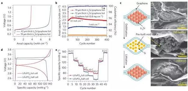 c)LixSi/石墨烯材料嵌鋰-脫鋰圖示(右側(cè)SEM圖中比例尺2um);和e)LixSi/石墨烯- LiFePO4電池(全電池)與Li - LiFePO4電池(半)的充放電性能曲線對比;