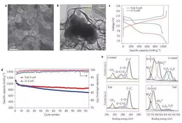 c)LixSi/石墨烯- 硫電池與鋰-硫電池的電學(xué)性能對比;