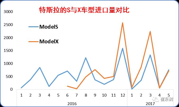 在特斯拉MODEL X推出時(shí),中國市場(chǎng)也是很喜歡特斯拉的SUV類車型,形成16年8月開始的爆發(fā)增長,但市場(chǎng)的零售走勢(shì)偏弱,因此17年的4-5月的model X進(jìn)口量大幅減少,X與S的進(jìn)口量拉平,其背后就是17年的X零售不強(qiáng),形成X僅稍高于S的零售局面,中間庫存估計(jì)有2000臺(tái)左右。