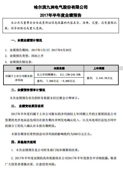 中國(guó)儲(chǔ)能網(wǎng)訊:北極星風(fēng)力發(fā)電網(wǎng)獲悉,九洲電氣近日發(fā)布預(yù)告稱2017年上半年預(yù)計(jì)盈利7300-8000 萬(wàn)元,主要原因是公司簽署的光伏電站總包項(xiàng)目在報(bào)告期內(nèi)并網(wǎng)發(fā)電確認(rèn)收入,以及風(fēng)電項(xiàng)目總包合同中的部分工程收入確認(rèn)在本報(bào)告期所致。以下為預(yù)告原文: