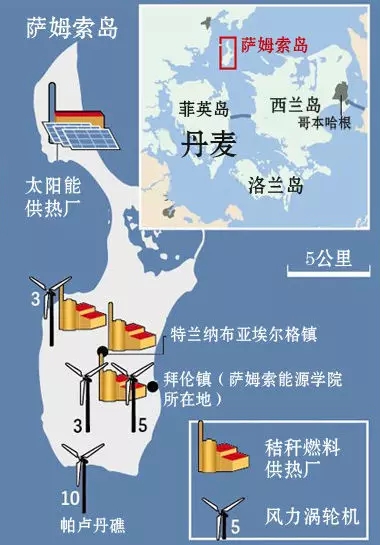 如今島上生產(chǎn)的風(fēng)能和太陽能約是整個(gè)島電力消耗的3倍。除此之外,現(xiàn)在島上還有先進(jìn)的零碳區(qū)域供熱系統(tǒng)等可再生能源設(shè)施。薩姆索島上修建了11座風(fēng)力渦輪機(jī),可滿足其全部的電力需求。同樣,島上大部分供熱分別來自4個(gè)區(qū)域供熱廠,這些供熱廠用木屑、麥稈與太陽能電池板供電。