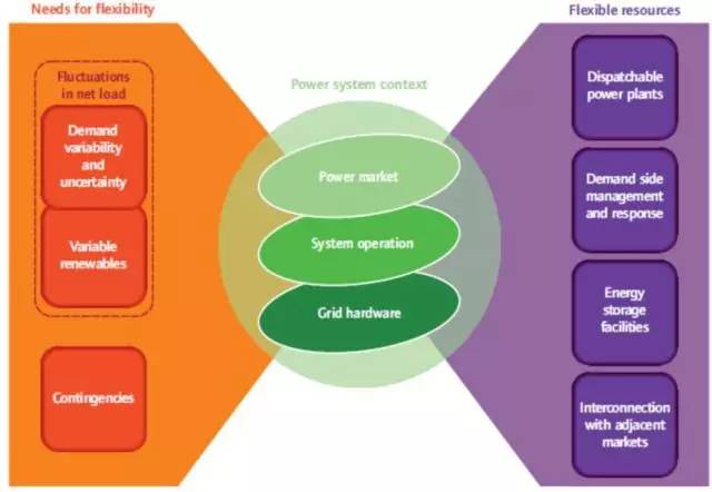 IEA將風(fēng)電和光伏統(tǒng)稱為VariableRenewableEnergy,即VRE。作為風(fēng)電和光伏的統(tǒng)稱,VRE很好的概括并體現(xiàn)了風(fēng)電和光伏發(fā)電的特點(diǎn)。而解決VRE的消納問題,關(guān)鍵則在于電力系統(tǒng)柔性是否充足。柔性一詞在歐美國家較為常用,根據(jù)IEA的定義,柔性(Flexibility)是描述一個(gè)電力系統(tǒng)應(yīng)對可預(yù)期的或者不可預(yù)期的變化的能力,以此保證發(fā)電和用電的平衡。也就是說柔性是描述一個(gè)電力系統(tǒng)應(yīng)對突發(fā)“不平衡事件”的能力,體現(xiàn)為單位時(shí)間內(nèi)向上或向下輸出一定功率的能力。當(dāng)電力系統(tǒng)出現(xiàn)負(fù)荷波動或不確定性,以及發(fā)電機(jī)組突然停機(jī)脫網(wǎng)等特殊情況時(shí),電力系統(tǒng)都需要通過柔性源加以應(yīng)對。隨著可再生能源發(fā)電規(guī)模的增加,電力系統(tǒng)的柔性能力顯得愈發(fā)重要。為什么提供柔性能力的是柔性源而不是發(fā)電機(jī)組呢?因?yàn)槿嵝栽床恢皇前l(fā)電機(jī)組,還包括現(xiàn)貨市場(通過電價(jià)信號引導(dǎo)負(fù)荷)、需求響應(yīng)(demandresponse)、儲能和區(qū)域間聯(lián)絡(luò)線(跨區(qū)或者跨國電力交易)等多種方式,如下圖所示。