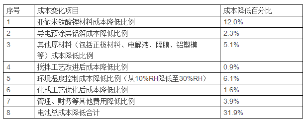 另一方面是電池生產(chǎn)工藝上的重構(gòu)。在電極材料的勻漿環(huán)節(jié),將常規(guī)攪拌工藝改為高粘度攪拌工藝;在電極制作環(huán)節(jié),將進口預涂層集流體改為自主研發(fā)的預涂層集流體;在電池制作的環(huán)境控制環(huán)節(jié),可將環(huán)境濕度由10%放寬到30%;在電池制作工序上,可以取消涂布前卷料烘干和注液前電芯烘干兩個烘干工序。以上針對勻漿、預涂層集流體、環(huán)境控制、電池制作工序等環(huán)節(jié)分別進行技術(shù)重構(gòu),降低電池成本。