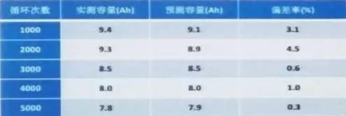 該方法以1000次循環(huán)實測數(shù)據(jù),在前3000次循環(huán)擬合較為準確,之后的偏差率較大,主要原因是不同電池之間差異性造成性能衰退趨勢不同。