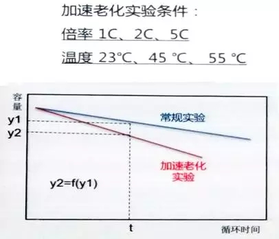 在實驗中,通過對電池在常規(guī)實驗和加速老化實驗條件下的定期表征,找尋不同條件下電池特性一致的等效點,建立等效點之間的函數(shù)關(guān)系(y2=f(y1)), 從而以加速實驗條件的數(shù)據(jù)對常規(guī)1C、23℃實驗條件下的數(shù)據(jù)進行預測和估算。