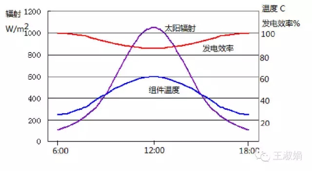 在正午12點(diǎn)附近,圖中光伏組件的溫度達(dá)到60攝氏度左右,光伏組件的輸出功率大約僅有85%左右。