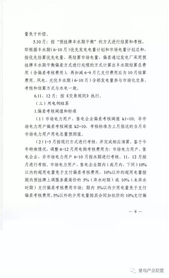 1-5月按現(xiàn)行方式進行考核,并完成相應清算,鑒于今年特殊情況,調整6-12月用電側考核費用為:市場電力用戶、售電企業(yè)、非市場電力用戶6-10月按水期進行考核,11、12月按月進行考核,市場電力用戶、售電企業(yè)期內(或月內,下同)10%以內的超用電量免于支付偏差考核費用,10%以外的超用電量按期內預掛牌上調服務最高價的5%(棄水時期)或10%(未棄水時期)支付偏差考核費用市場;期內5%以內少用電量免于支付偏差考核費用,5%以外的少用電量按其合同加權的10%支付偏差考核費用。