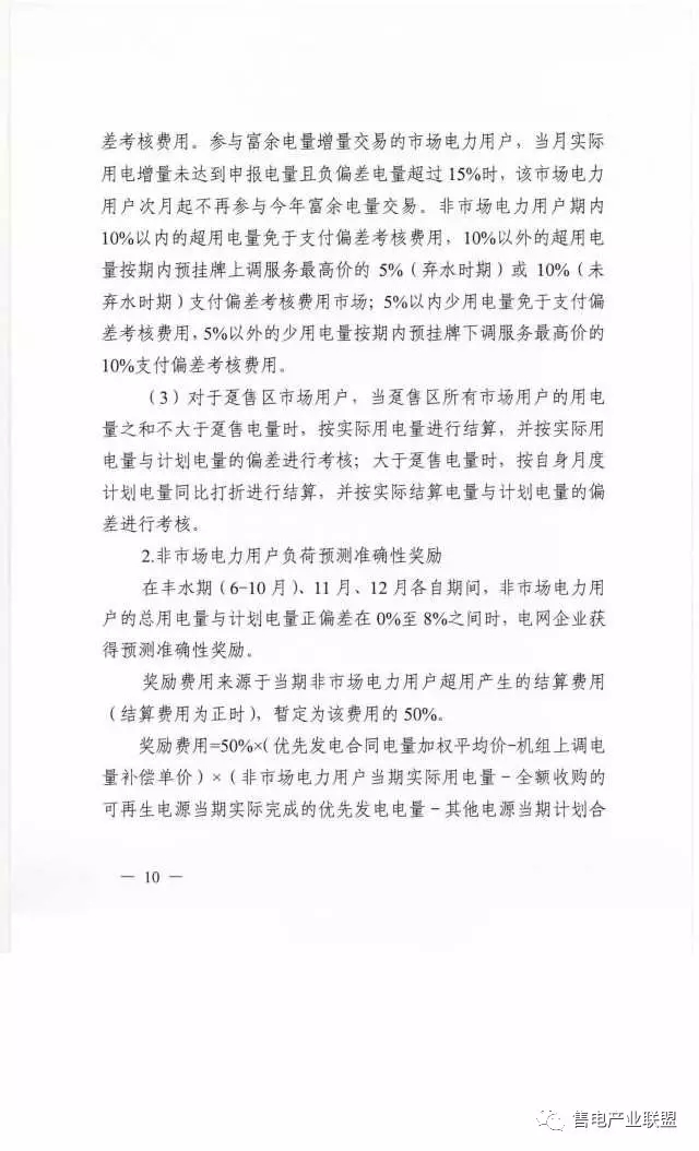 參與富余電量增量交易的市場電力用戶,當月實際用電量未達到申報電量且負偏差電量超過15%時,該市場電力用戶次月起不再參與今年富余電量交易。非市場電力用戶期內10%以內的超用電量免于支付偏差考核費用,10%以外的超用電量按期內預掛牌上調服務最高價的5%(棄水時期)或10%(未棄水時期)支付偏差考核費用市場;5%以內少用電量免于支付偏差考核費用,5%以外的少用電量按期內預掛牌下調服務最高價的10%支付偏差考核費用。