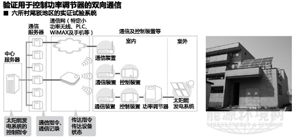 包括獨(dú)棟住宅原先設(shè)置的系統(tǒng)在內(nèi),試驗(yàn)共利用了5套太陽能發(fā)電系統(tǒng)。功率調(diào)節(jié)器可通過聯(lián)盟成員NEC公司準(zhǔn)備的控制裝置進(jìn)行通信。從中心服務(wù)器,經(jīng)由通信服務(wù)器、通信網(wǎng)、通信分機(jī)及控制裝置向功率調(diào)節(jié)器發(fā)出控制指令。再由功率調(diào)節(jié)器按原路返回控制結(jié)果。