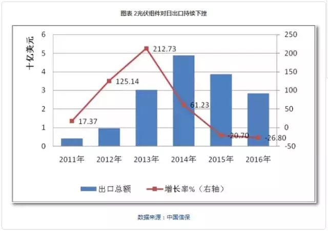 日本仍為我國(guó)光伏組件出口的第一大市場(chǎng),但2016年,我國(guó)對(duì)日光伏組件出口金額28.34億美元,較2015年同比下滑26.80%。