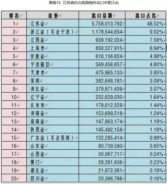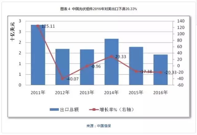 2016年,美國(guó)市場(chǎng)占中國(guó)組件出口的市場(chǎng)份額下降到11%,出口金額下降20.33%,為14.27億美元。