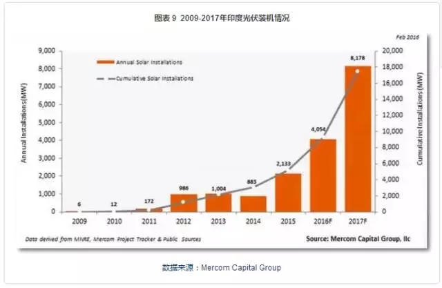 展望2017年,印度目前有14.2GW的太陽(yáng)能發(fā)電項(xiàng)目正在開發(fā)中,6.3GW的太陽(yáng)能發(fā)電正在招標(biāo)中。我們初步預(yù)計(jì)印度2017年太陽(yáng)能發(fā)電量將增加8.7GW,包括1.1GW的屋頂太陽(yáng)能板發(fā)電計(jì)劃。