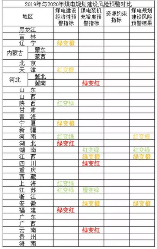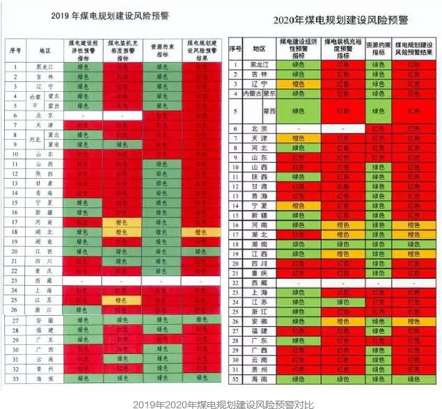 “資源約束指標(biāo)基于各省(區(qū)、市)的大氣污染物排放、水資源量、煤炭消費(fèi)總量以及其他相關(guān)資源情況,分為紅色、綠色兩個(gè)等級(jí)。對(duì)于大氣污染形勢(shì)嚴(yán)峻、水資源量不足、煤炭消費(fèi)總量亟需控制,或者存在其它資源約束煤電規(guī)劃建設(shè)的,資源約束指標(biāo)為紅色預(yù)警;其余為綠色?!?