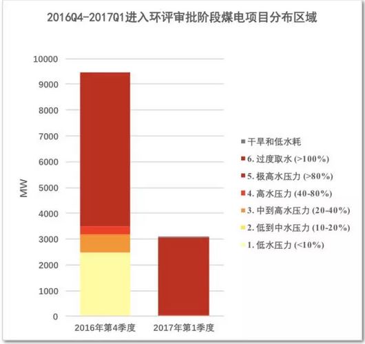 進(jìn)入環(huán)評(píng)審批階段的煤電項(xiàng)目中,超過70%的項(xiàng)目位于“過度取水”區(qū),超過75%的項(xiàng)目位于高水壓力地區(qū)。2017年第一季度更是幾乎全部進(jìn)入環(huán)評(píng)審批階段的煤電項(xiàng)目均分布在過度取水區(qū)。