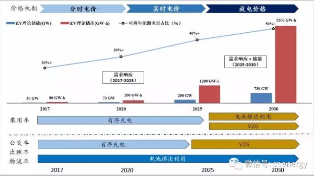 值得注意的是,《報(bào)告》發(fā)布了新能源發(fā)電與電動(dòng)汽車協(xié)同發(fā)展路線圖(如圖2)?!叭鐖D所示,可再生能源發(fā)電量占比將從目前25%提升至50%以上,電動(dòng)汽車儲(chǔ)能理論潛力也將從目前的30GW-100GWh提升至700GW-3800GWh?!眲?jiān)強(qiáng)調(diào),在不同時(shí)段引入合理的價(jià)格機(jī)制和并網(wǎng)模式是發(fā)掘電動(dòng)汽車儲(chǔ)能潛力的關(guān)鍵。